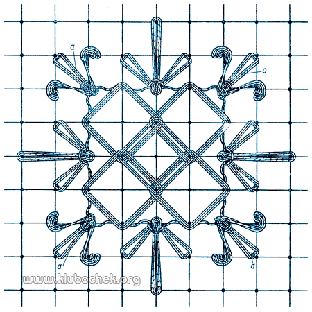 В ней вышито пять ромбиков, между которыми находятся лапки. По углам квадрата из 16 клеток вышиты фигурки а в виде усиков с листиком. Они вышиваются обвиванием горизонтального и вертикального столбиков клетки четырьмя нитками.