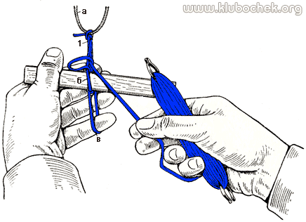 Из шнура или прочной нитки делают большую (вспомогательную) петлю а (в 15-20 см). Эту петлю прикрепляют к подушке или спинке стула. К петле привязывают нитку 1 челнока. В правую руку берут челнок, прижимают его мизинцем и безымянным пальцем к ладони. Три пальца (большой, указательный и средний) должны быть свободными, чтобы взять нитку челнока или перехватить ее при затягивании узла.